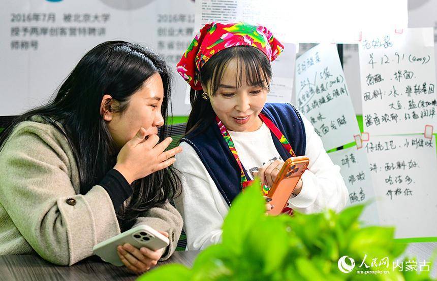 在乌兰浩特市乌兰哈达镇三合村电商直播基地,“连农学院”教师张美欣(右)指导学员直播带货。王正摄