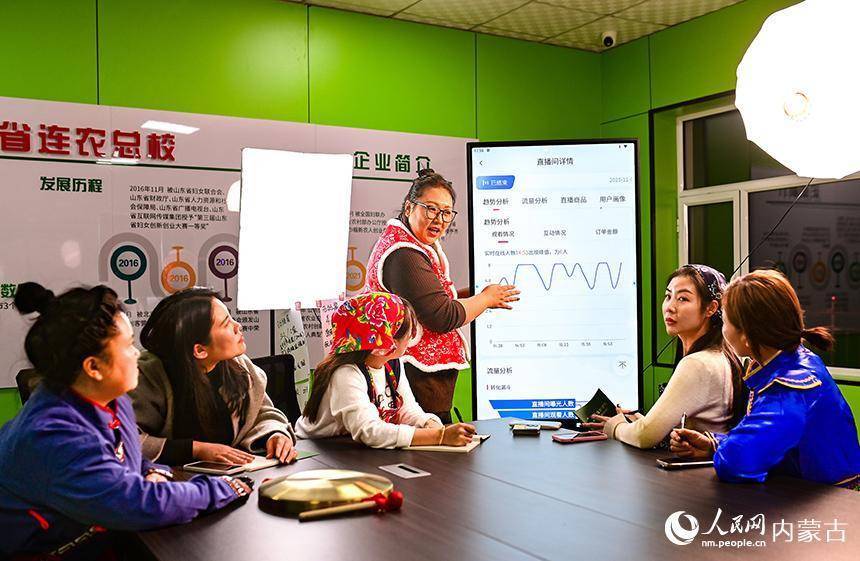 在乌兰浩特市乌兰哈达镇三合村电商直播基地,“连农学院”教师张美欣(右三)向学员传授直播带货技能。王正摄
